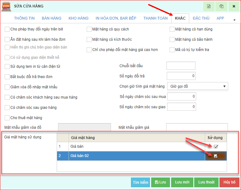 - Vào tab "KHÁC", ở vùng Giá mặt hàng sử dụng, bạn tick chọn vào ô Sử dụng